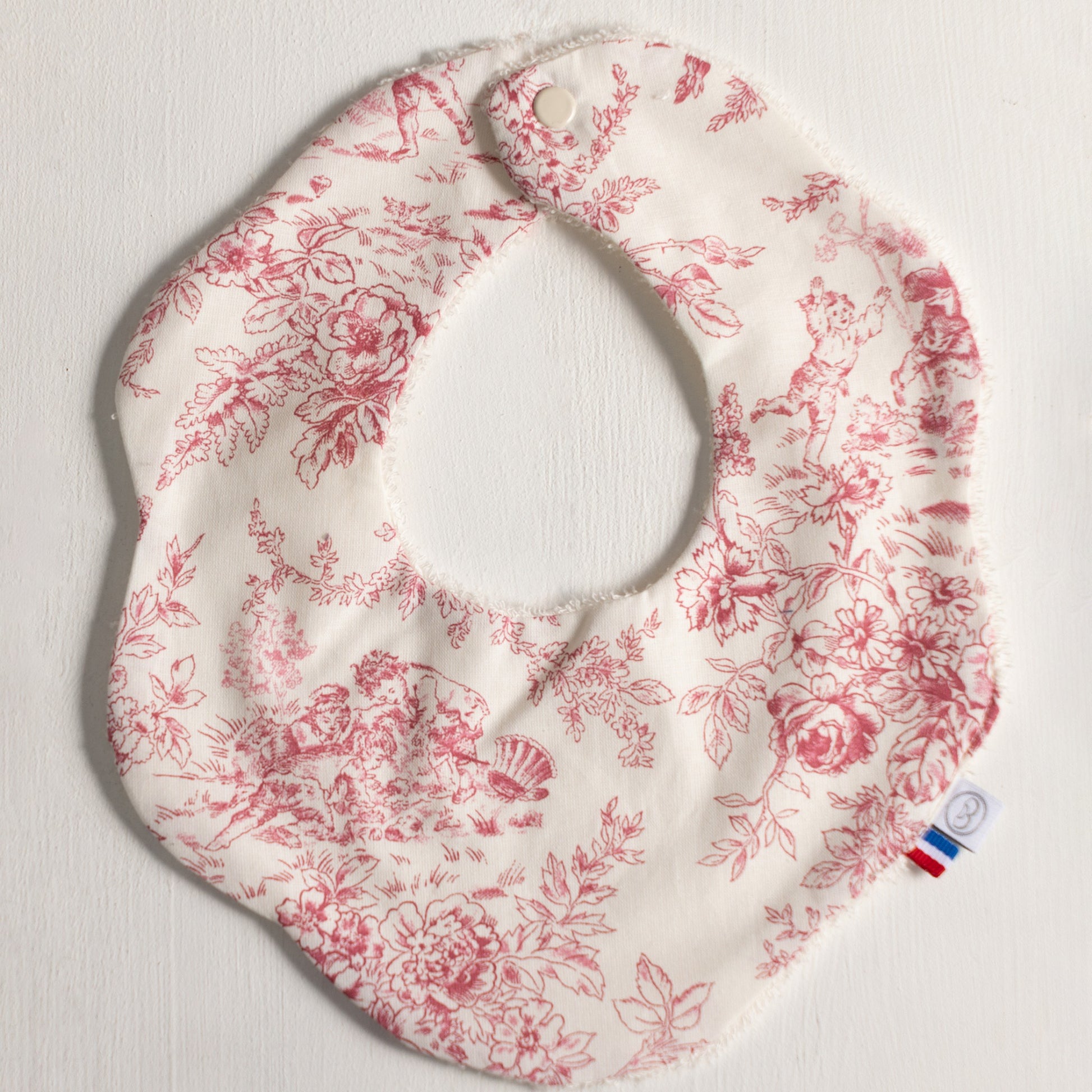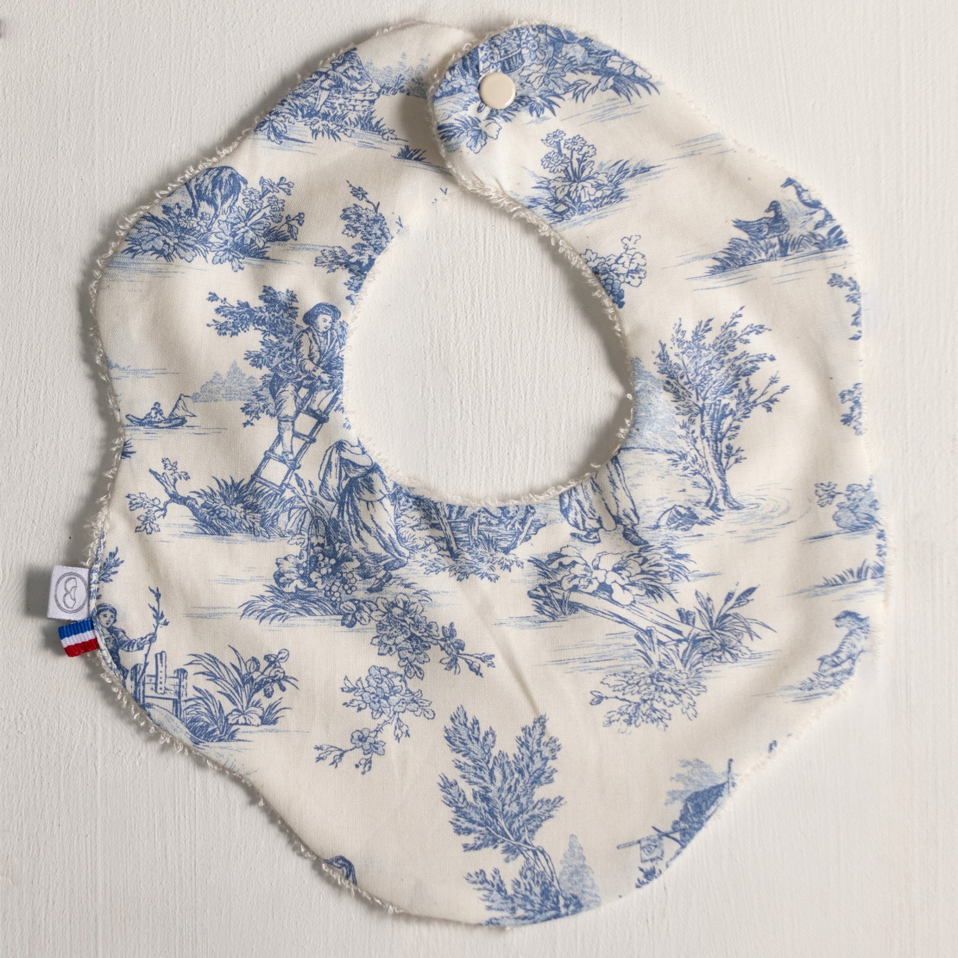 Céleste bib in cotton toile de Jouy and the back is in bamboo sponge with a bias finish.
