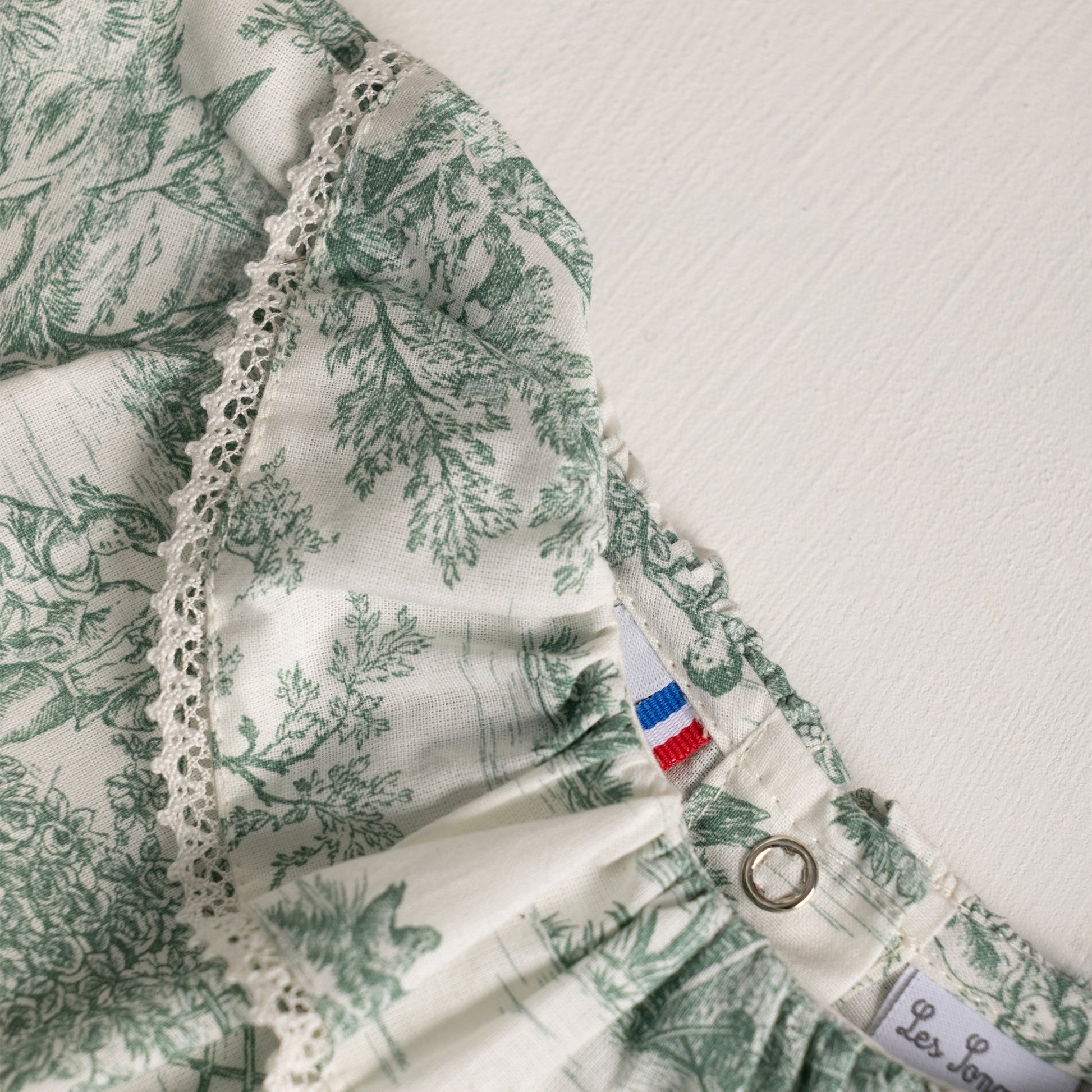 Céleste blouse in toile de Jouy, with a small Claudine collar, a croquet embellishes this little collar.