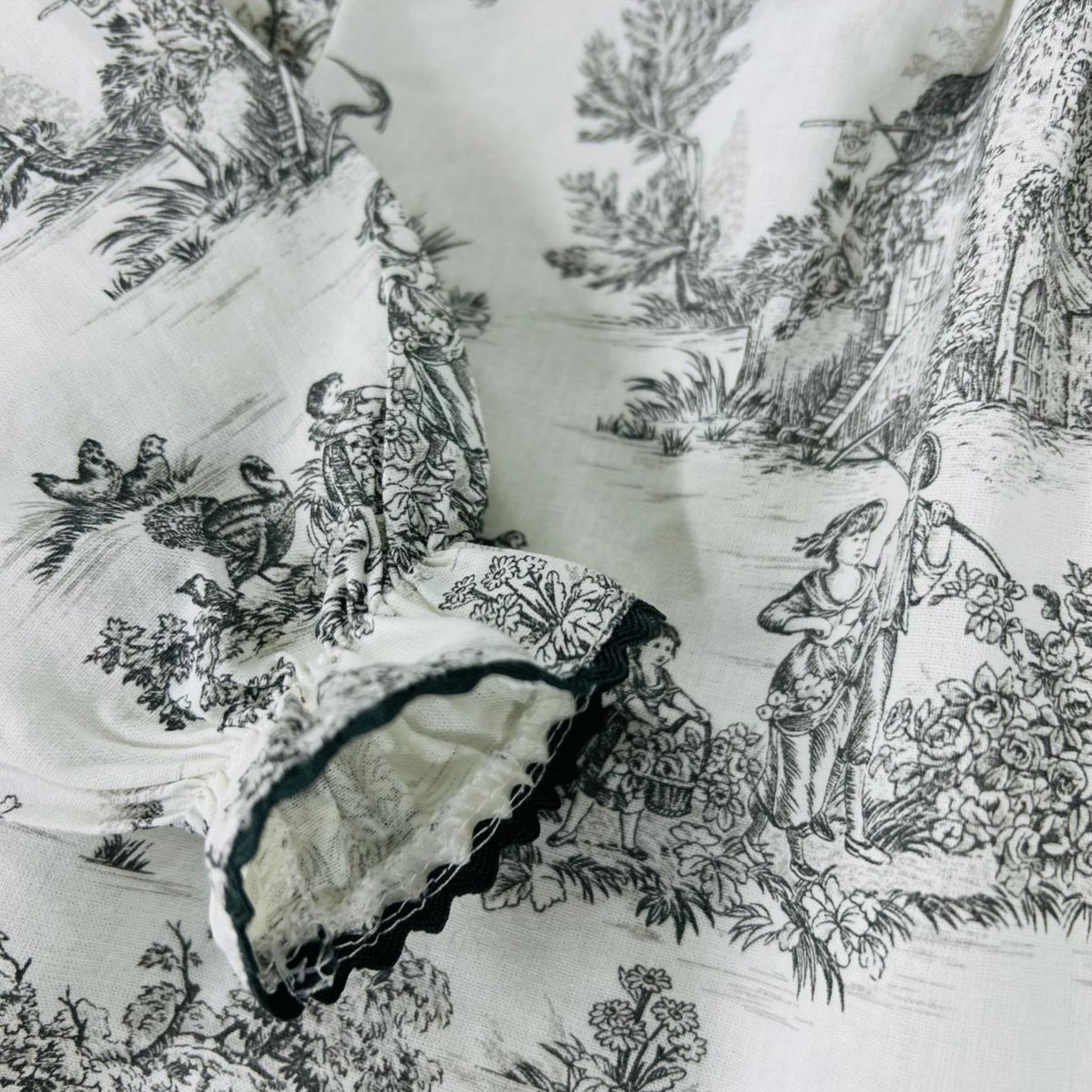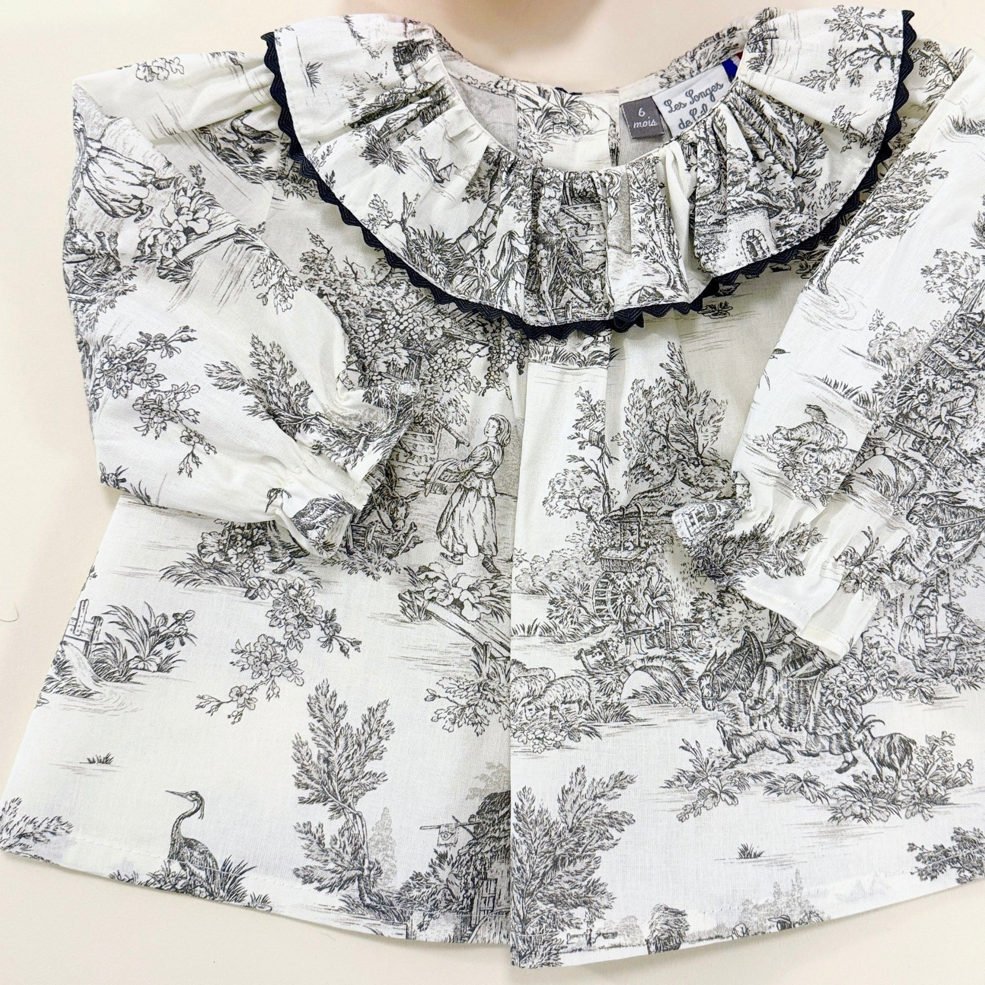 Céleste blouse in toile de Jouy, with a small Claudine collar, a croquet embellishes this little collar.