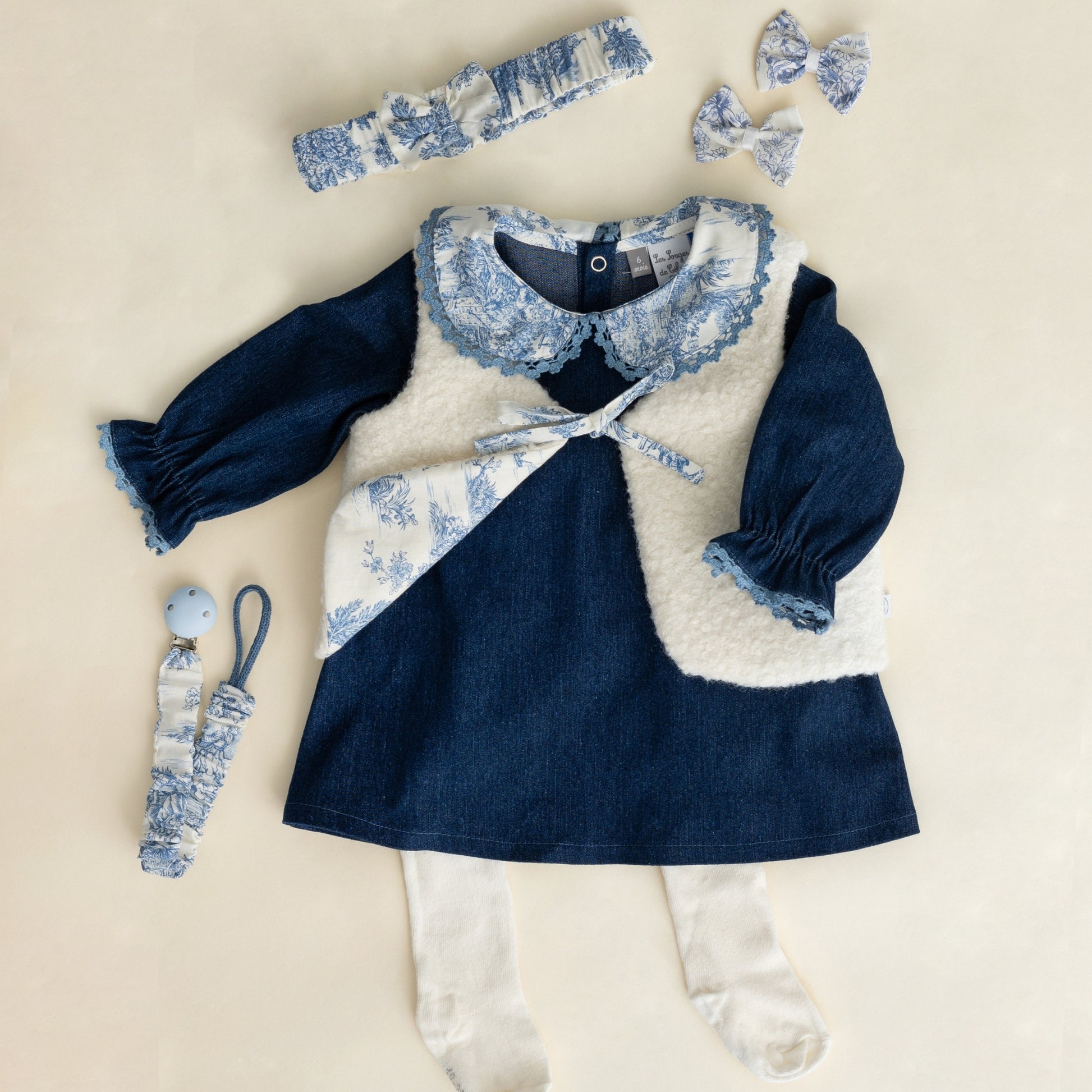 Notre robe signature en jean, détails au niveau du col dans notre motif inspiration toile de Jouy, manches longues.