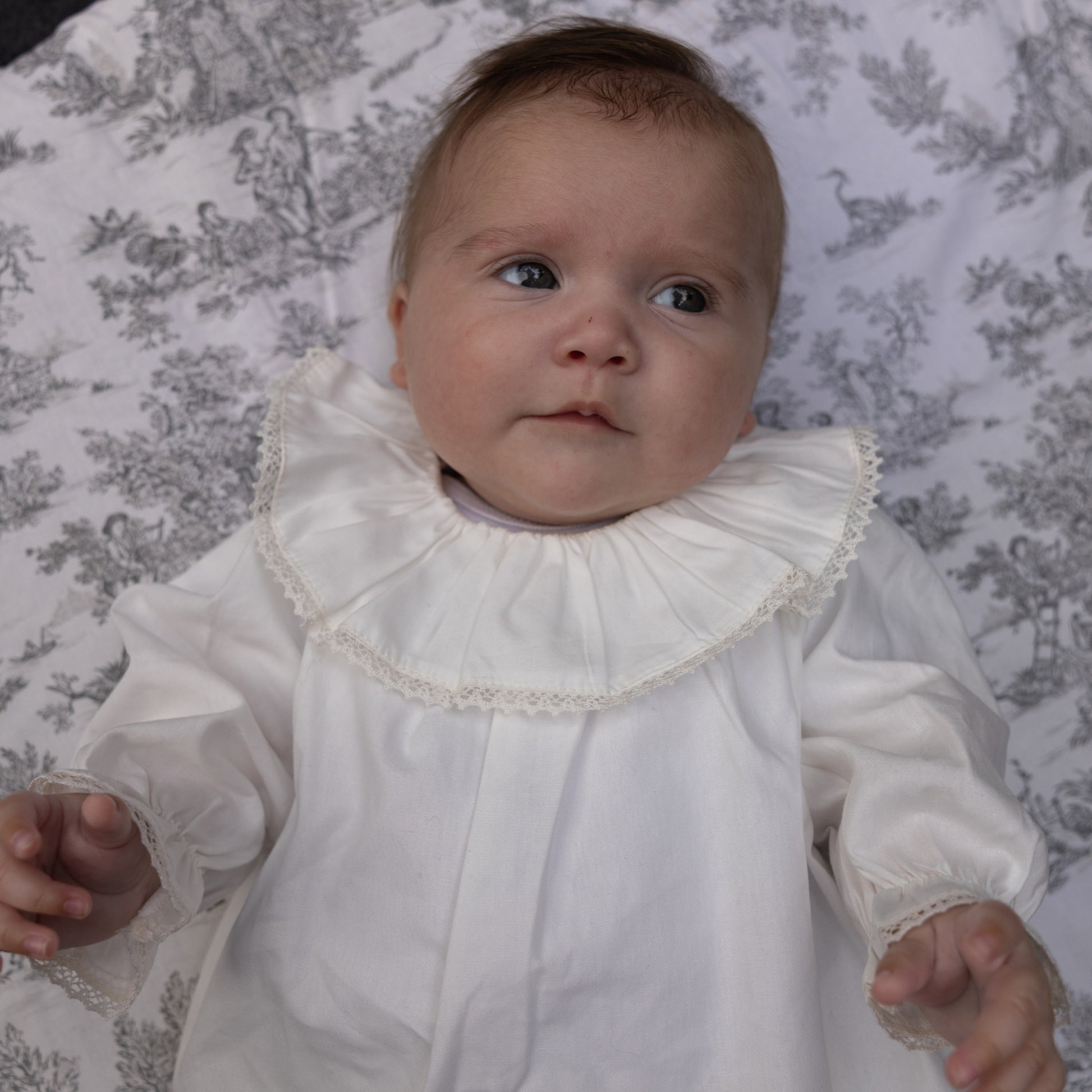 Offrez à votre bébé une touche de raffinement avec notre blouse Adèle, confectionnée en coton écru et sublimée par un col volanté délicatement orné de dentelle ton sur ton.