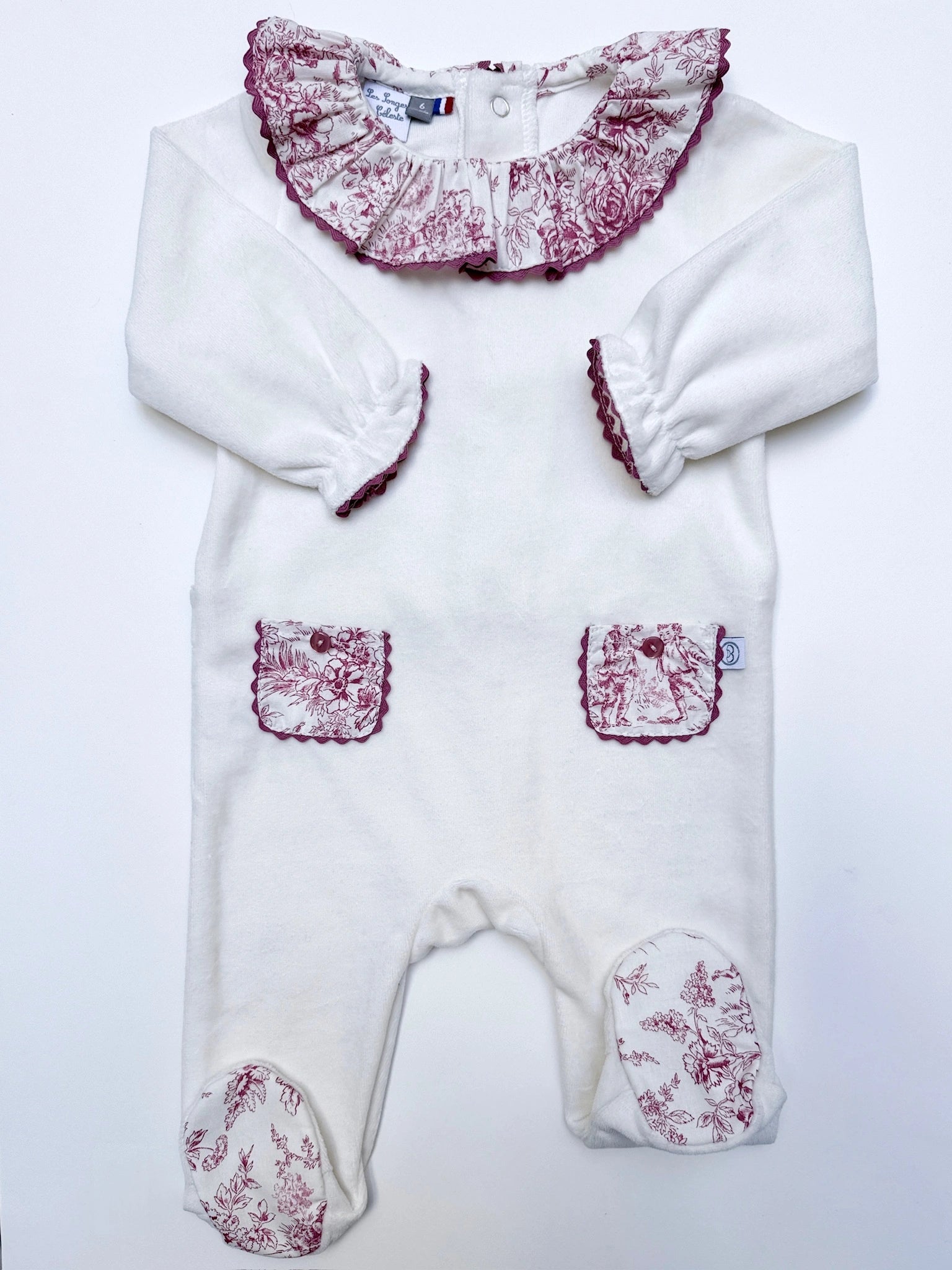Its soft, enveloping fabric ensures optimal comfort, while its delicate finishes a ruffled collar trimmed with fine lace, elasticated cuffs highlighted with matching lace, and a Toile de Jouy print pay tribute to the elegance of French childhood.