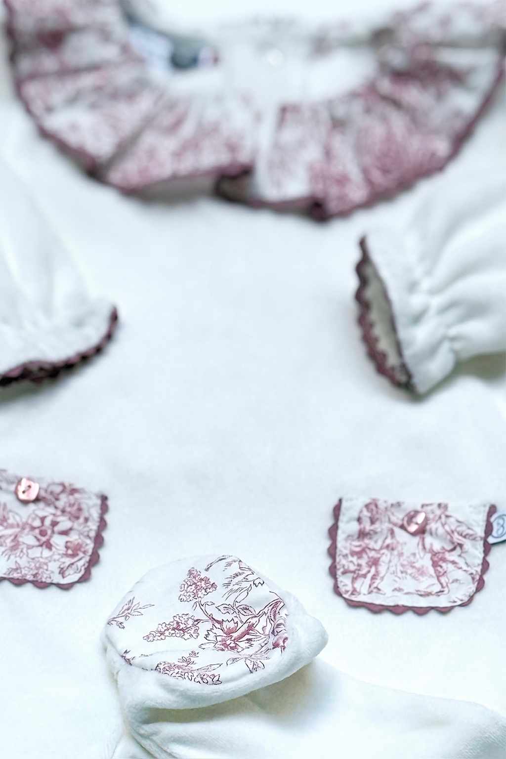 Sa matière moelleuse et enveloppante assure un confort optimal, tandis que ses finitions délicates, col volanté orné de fine dentelle, poignets élastiqués soulignés de dentelle ton sur ton, et imprimé toile de Jouy, rendent hommage à l’élégance de l’enfance à la française.